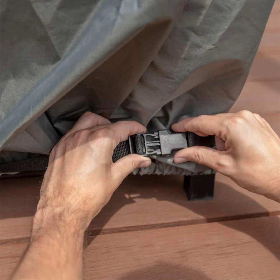 Solide et résistante, la housse possède un revêtement en polyester 300 D et d’un tissu imperméable enduit de PVC. Dotée d’un traitement anti-UV, la housse ne se décolore pas.