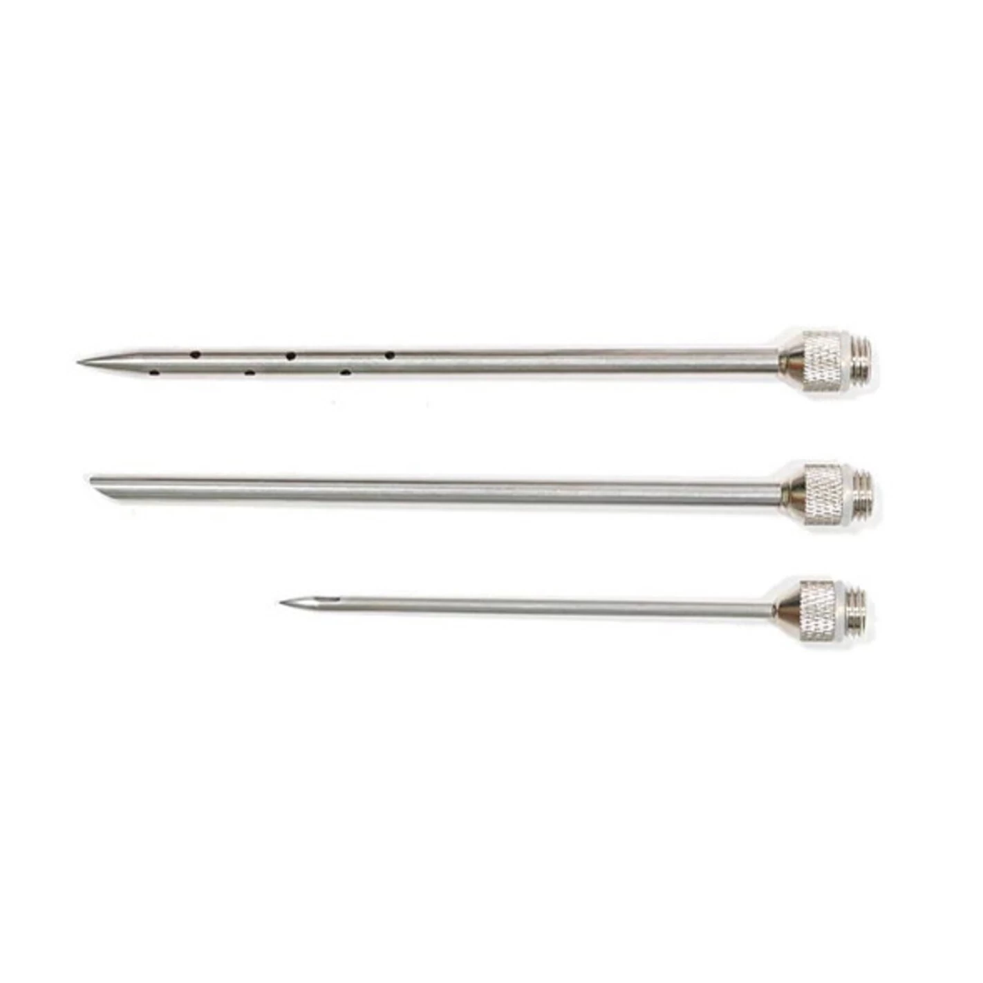 - La deuxième aiguille, de longueur similaire, présente plusieurs trous sur les côtés et aucun sur la pointe, ceci afin de favoriser une diffusion homogène des marinades dans les grosses pièces de viande comme un rôti de boeuf, un épaule d’agneau ou une échine de porc.